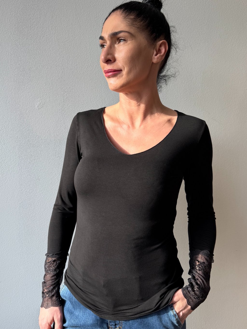 čipkované rukávy| V- výstrih